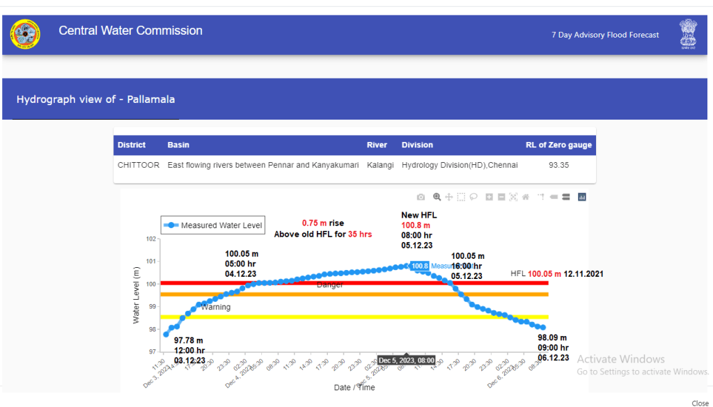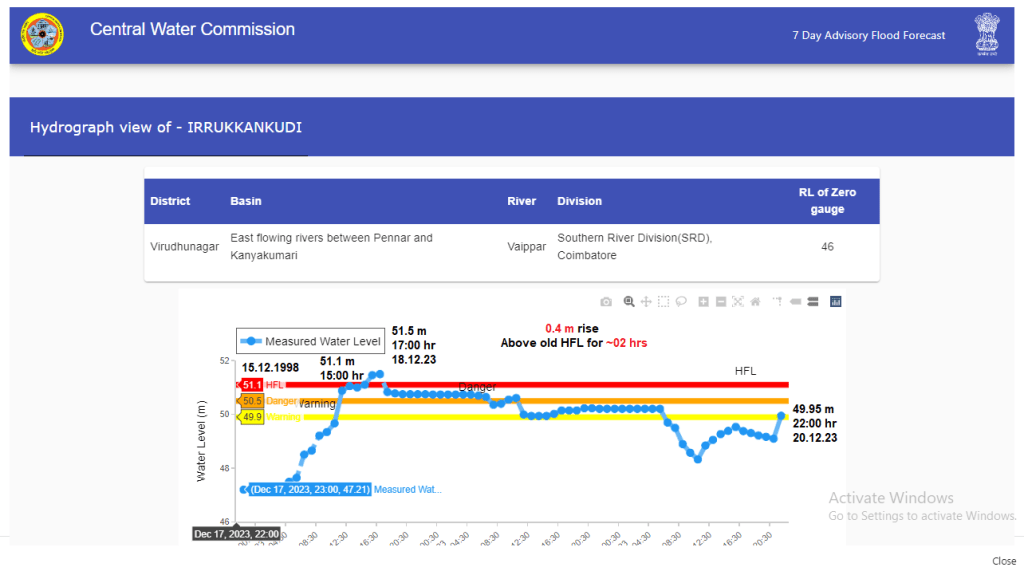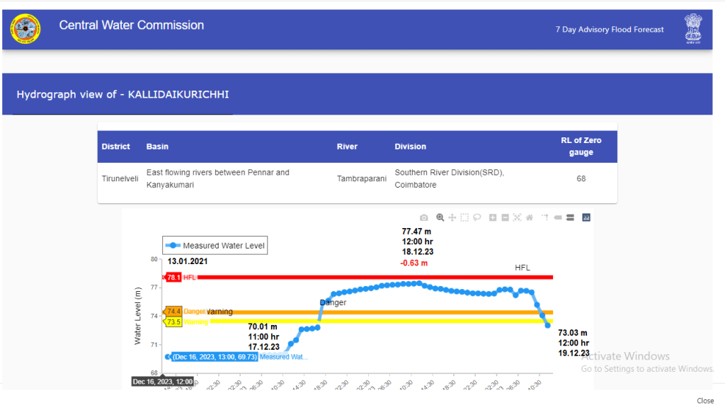 It’s worth mentioning that the hydrograph for Murappanadu site did not record hourly water level for about 13 hours (between 17:00 hour 18.12.2023 to 09:00 hour 19.12.2023) because the site was completely inundated by Thambraparani floods and unapproachable for CWC staff. Hence, the peak level attained there could possibly be higher than 23.595 meter.