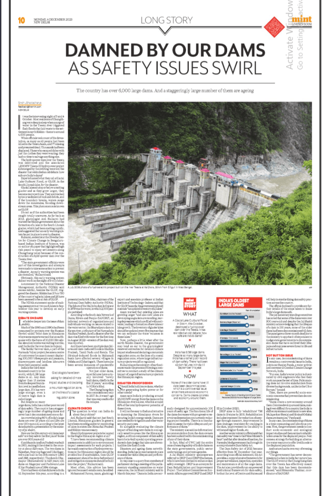 In any case, decommissioning of dams is a time-consuming and laborious process. And nature has its own way of evening out things. “The government has never decommissioned a dam in India but nature has. The GLOF event at the Chungthang dam over the Teesta has effectively meant that this dam has been decommissioned,” said Himanshu Thakkar, coordinator of SANDRP. https://www.livemint.com/news/damned-by-our-dams-as-safety-issues-swirl-11701605096020.html (03 Dec. 2023)