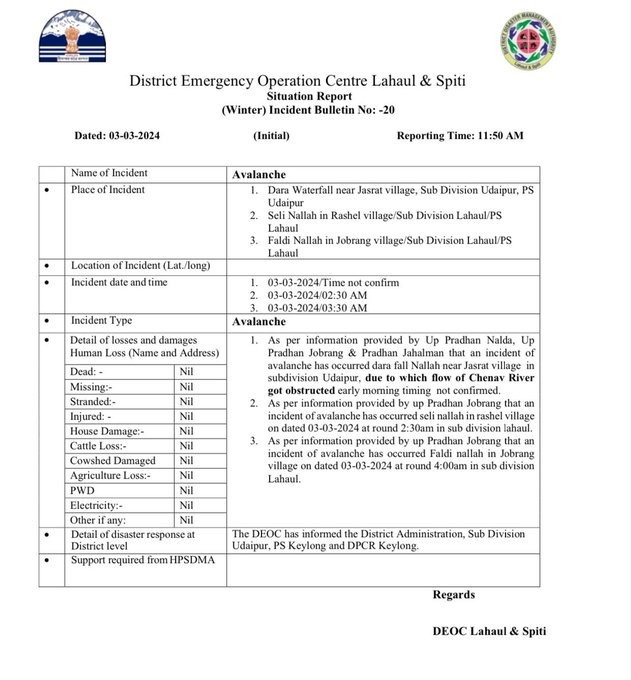 – Incidents of multiple avalanches occurred in Lahaul and Spiti at Seli Nallah in Rashel village, Faldi Nallah in Jobrang, Cho Veer Mod in Lohni and Tatha Nallah near Udaipur village. An avalanche was also reported near Karcham helipad in Sangla in Kinnaur district, the officials said.