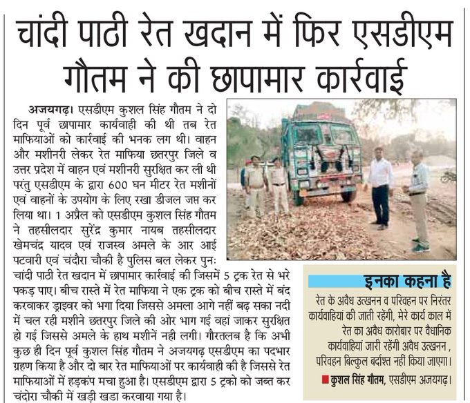 He acknowledged sand mining in close proximity of Beera bridge on either side of river by miners from Chhatarpur side who escape action by fleeing to other side. As per him, the mining department cannot even stop the transportation of same illegally mined sand through Panna district as the permits are legal.