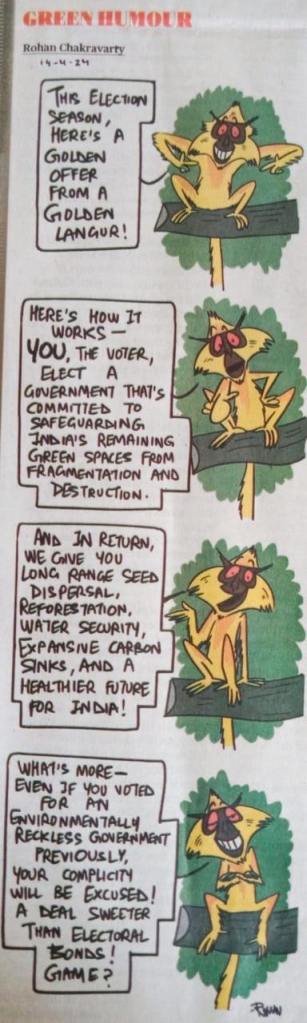 Green groups ask people to vote for nature, future The 70 environment, climate action, youth, forest and natural ecosystem groups from across India has urged people to think of the future of democracy, especially the youth and their right to clean air and water security before polling their votes as the country faces extreme impacts of global warming, climate change, water crisis, scanty and unpredictable rainfall, melting glaciers and increasing pollution. https://timesofindia.indiatimes.com/india/environment-youth-forest-citizens-groups-ask-people-to-vote-for-nature-democracy-future-of-youth/articleshow/109377859.cms (17 April 2024)
