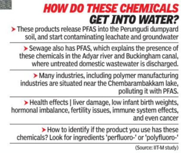 Chennai Hazardous ‘forever’ chemicals found in lakes, rivers, GW –CPCB has not recognised perfluoroalkyl substances and polyfluoroalkyl substances (PFAS), which are hazardous ‘forever’ chemicals. They can cause diseases ranging from liver damage to cancer.Now, an IIT Madras study has revealed that PFAS concentration in the city waters is about 19,400 times more of these ‘forever chemicals’ than the American Environmental Protection Agency’s (EPA) safety levels. These PFAS were found in the groundwater in and around the Perungudi dumpyard, Adyar river, Buckingham Canal, Chembarambakkam lake and the treated water from the lake.