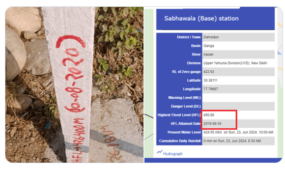 A pillar at the site mentions 426.400 meter as highest flood level (HFL) attained at the site on 10.08.2020. However, as per the CWC website the HFL for the site is 450.85 meter achieved on 30.09.2019.
