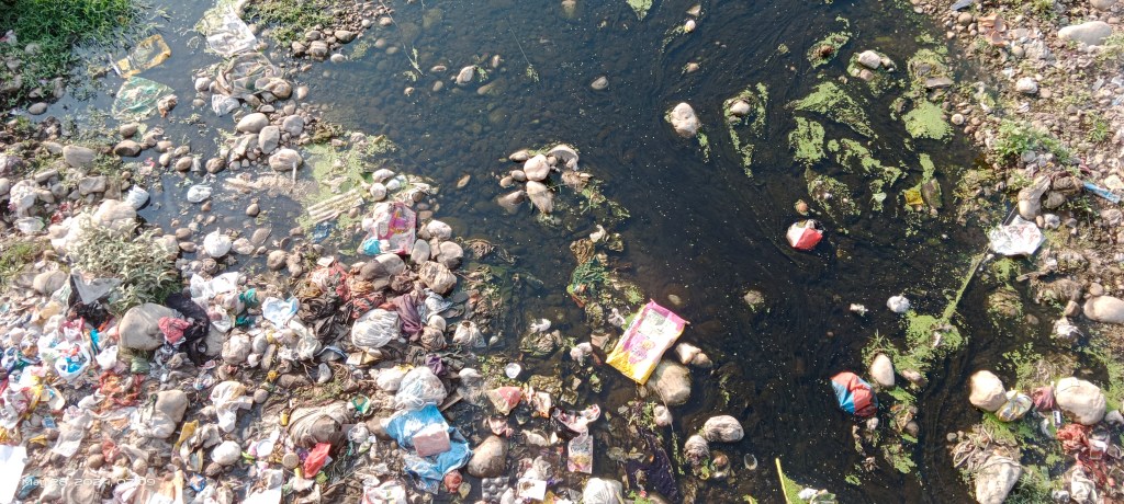 About 15-meter-long river stretch is fully covered with plastic waste at Shanidev Enclave.