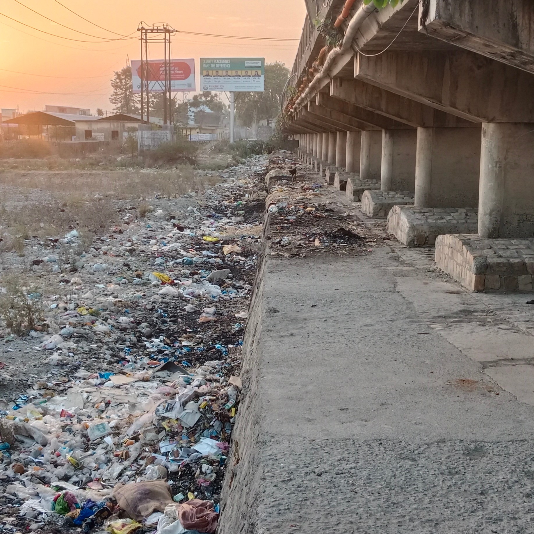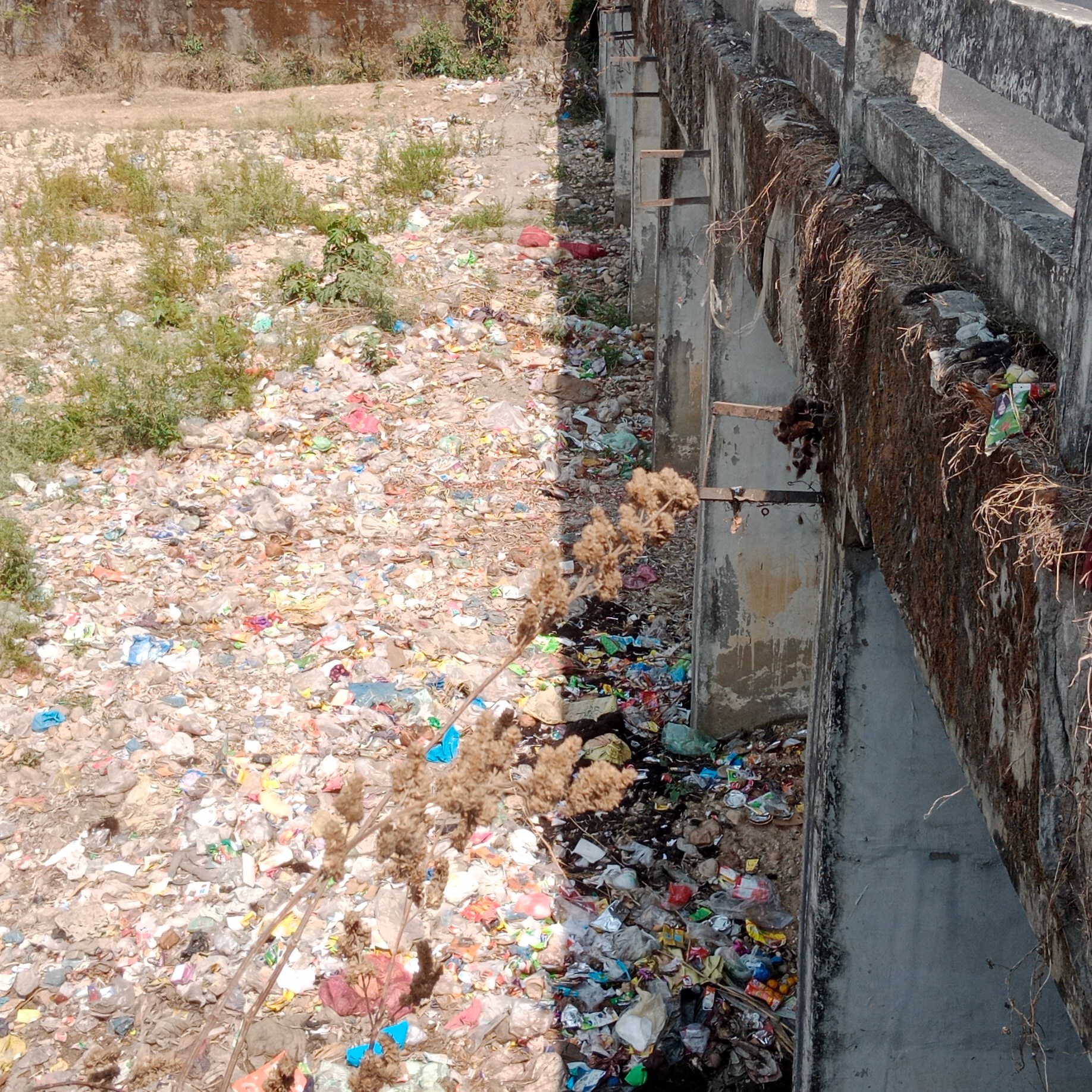 The riverbed is full of gravels and mostly covered with municipal waste. Local people also visit the bridge to dump religious waste in the river.