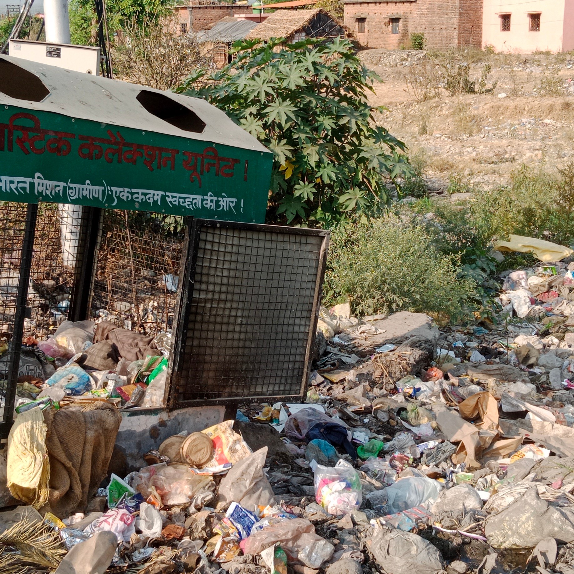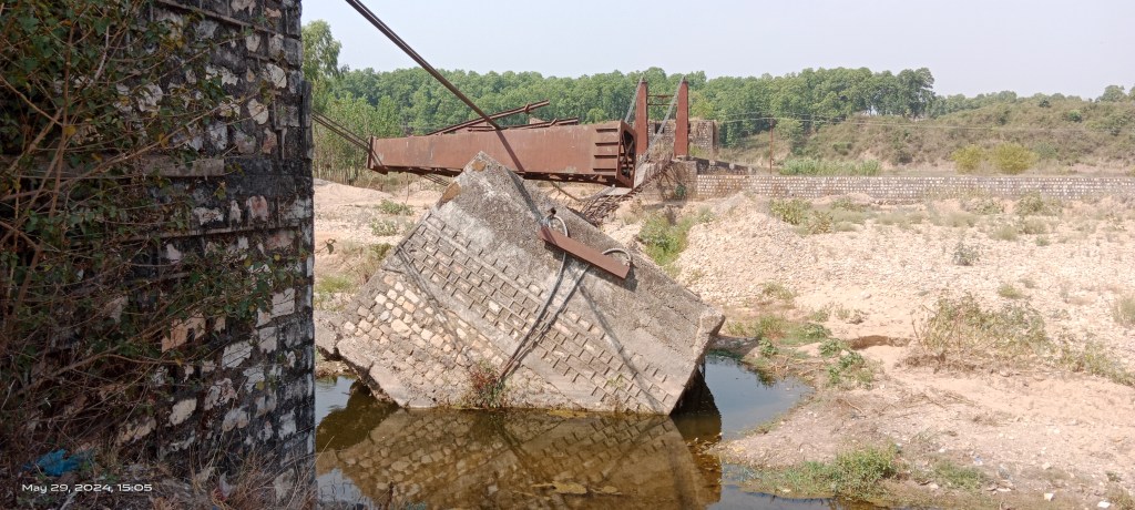 Downstream the broken bridge a board is placed claiming the land belonged to graveyard for Hindu kids.