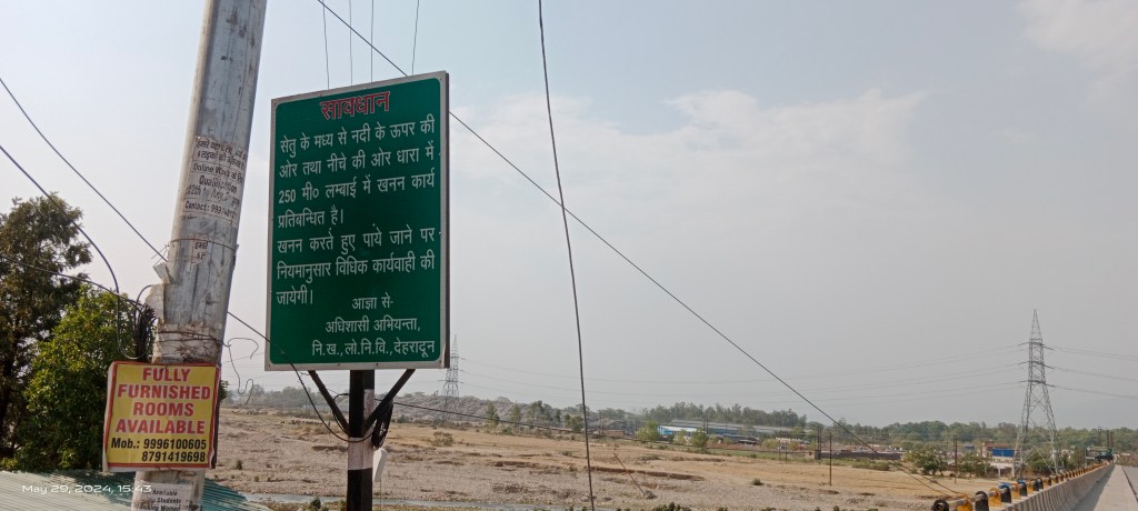 The Public Work Department (PWD), Dehradun has placed notice boards on both end of the bridge prohibiting riverbed mining upto 250 meters up and downstream from the bridge.
