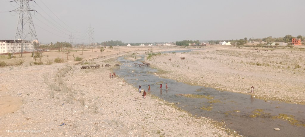 People were bathing and fishing in the shallow water of the river. Van Gurjar community had set up their tents beneath the bridge. Their cattle were roaming around the riverbed.