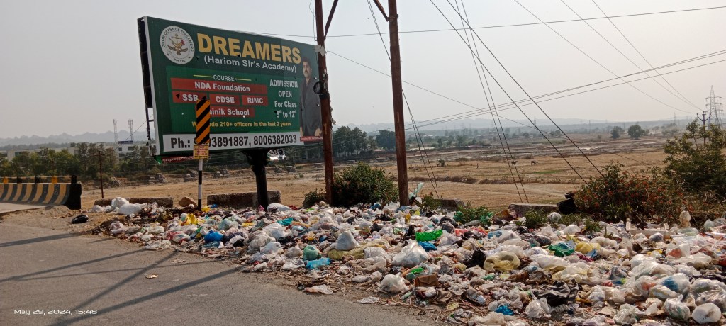Solid waste in huge quantity was dumped close to the bridge despite a Municipal Corporation board placed there informing about fines against such dumping.