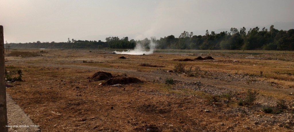 The riverbed is filled with pits probably created by the gravel mining. There is a crematorium by the river but a half burnt pyre is seen the middle of the river.