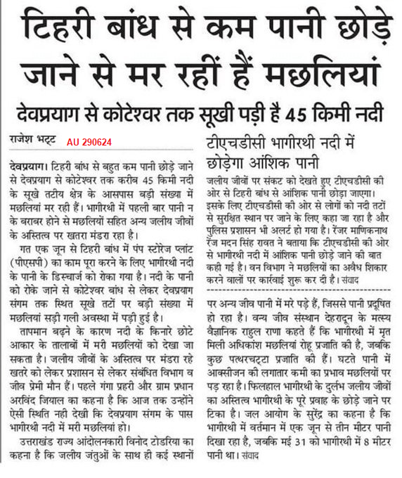 टिहरी बांध में पहली जून से 15 जुलाई तक बिजली का उत्पादन बंद रह सकता है। क्योंकि टिहरी हाइड्रो डेवलपमेंट कारपोरेशन (टीएचडीसी) को पंप स्टोरेज प्लांट (पीएसपी) के अंतिम चरण का काम करना है। यह काम पहली जून से प्रस्तावित है। इसके लिए टीएचडीसी प्रबंधन ने केंद्र सरकार से टिहरी बांध से पानी न छोड़े जाने की अनुमति मांगी है। हालांकि अभी अनुमति मिली नहीं है। टिहरी बांध झील से पानी न छोड़े जाने की अनुमति मिलने पर भागीरथी नदी में भी जलस्तर काफी कम हो जाएगा। हालांकि टीएचडीसी प्रबंधन का कहना है कि इस दौरान एक अन्य सुरंग से सिर्फ पांच क्यूमेक्स पानी भागीरथी नदी में छोड़ा जाएगा जिससे गंगा की अविरल धारा बनी रहे। https://www.jagran.com/uttarakhand/tehri-garhwal-electricity-production-may-remain-closed-for-45-days-in-tehri-dam-23718767.html (16 May 2024)