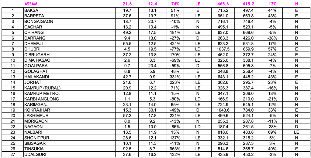 | Assam | N | +12 | 27 | 0 | 0 | 3 | 15 | 8 | 1 |