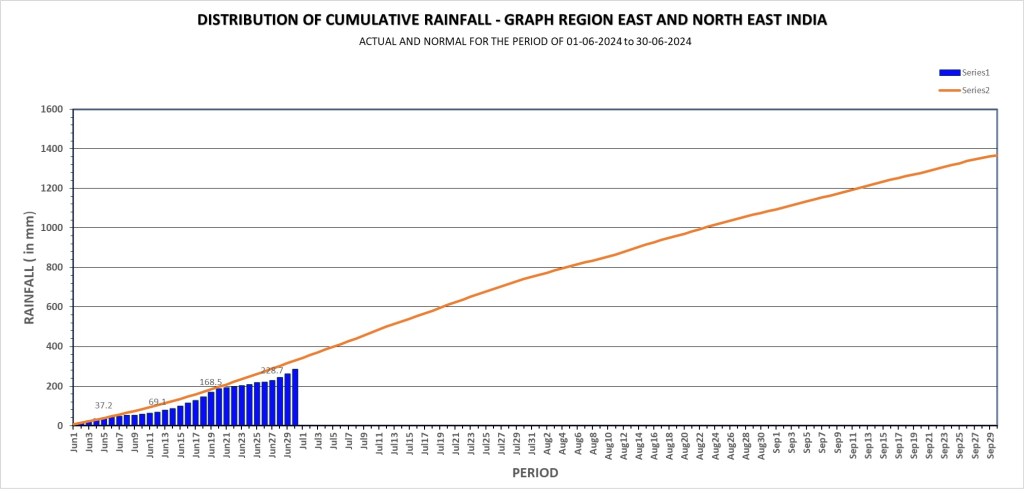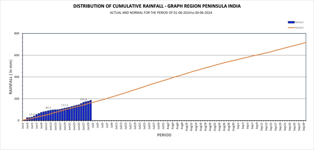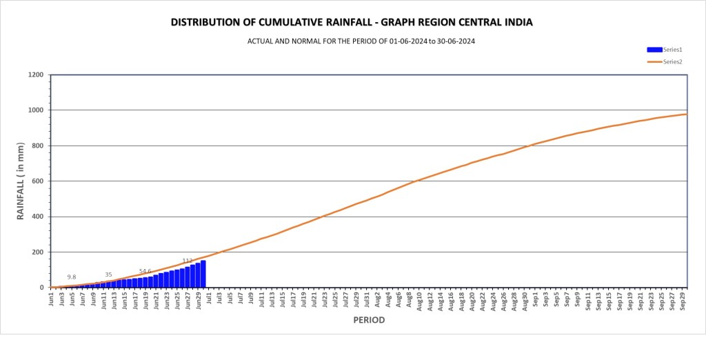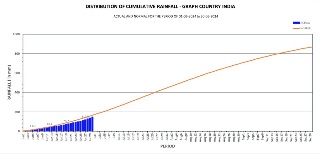 In the just concluded month June 2024, the first month of India’s South West 2023 monsoon, India received 147.2 mm rainfall, 11% below the normal June rainfall of 165.3 mm as per India Meteorological department. In June 2023 rainfall was 148.6 mm (10% below normal)[i], in June 2022 the rainfall was 152.3 mm (8% below normal)[ii], in June 2021, the rainfall was 182.9 mm[iii] (about 11% above normal) and in June 2020, the rainfall was 196.9 mm (about 18% above normal) and in June 2019 it was 33% below normal. So in six years from 2019 to 2024, India had below normal rainfall in 4 years in June, and above normal in two years (2020 and 2021). Six times in last ten years and nine times since 2008 June rainfall was below normal.
