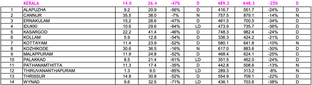 | Kerala | D | -25 | 14 | 0 | 0 | 10 | 4 | 0 | 0 |