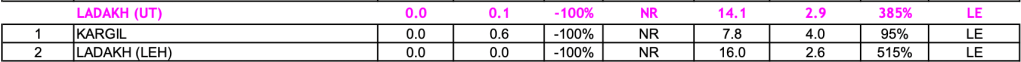 | Ladakh | E | +385 | 2 | 0 | 0 | 0 | 0 | 0 | 2 |