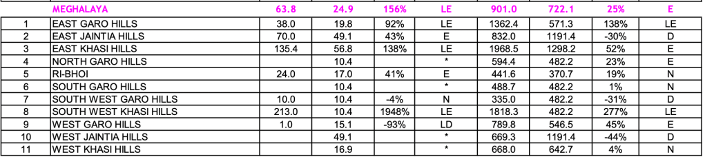 | Meghalaya | E | +25 | 11 | 0 | 0 | 3 | 3 | 3 | 2 |