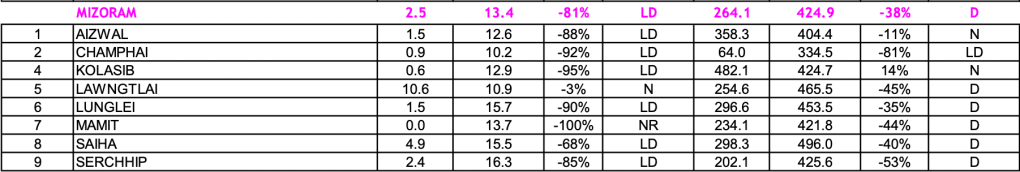 | Mizoram | D | -38 | 8 | 0 | 1 | 5 | 2 | 0 | 0 |