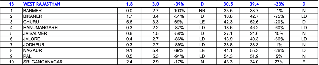| Rajasthan | N | -9 | 33 | 0 | 3 | 9 | 14 | 5 | 2 |