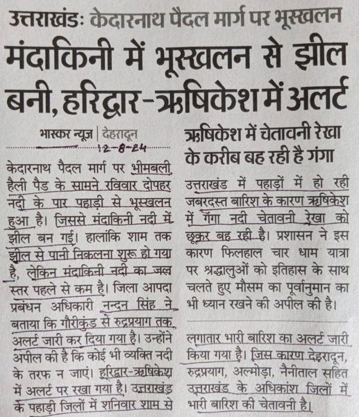 31 जुलाई को केदारनाथ घाटी में हुई बादल फटने की घटना के बाद आपदा प्रभावित क्षेत्र में मंदाकिनी नदी के किनारे भूस्खलन और मिट्टी का कटाव जारी है। रविवार (Aug. 12) को केदारनाथ पैदल मार्ग पर भीमबली के पास भारी भूस्खलन हुआ, जिसके बाद नदी में भारी मात्रा में मलबा गिरने से मंदाकिनी नदी का प्रवाह रुक गया। https://www.punjabkesari.in/national/news/rudraprayag-cloudburst-kedarnath-valley-landslide-mandakini-river-2018953 (12 Aug. 2024)