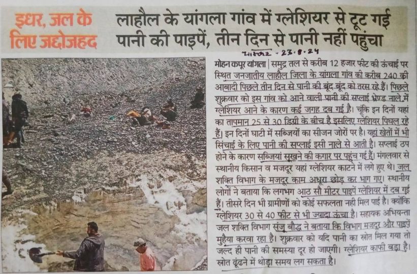 Himachal Pradesh News from a village in Lahaul Spiti district in HP. The language in this report is confusing, but what is possibly meant is that the glaciar has possibly burst and due to which the debris has buried the village water supply lines and they are finding it tough to remove the overburden of debris over the pipeline.