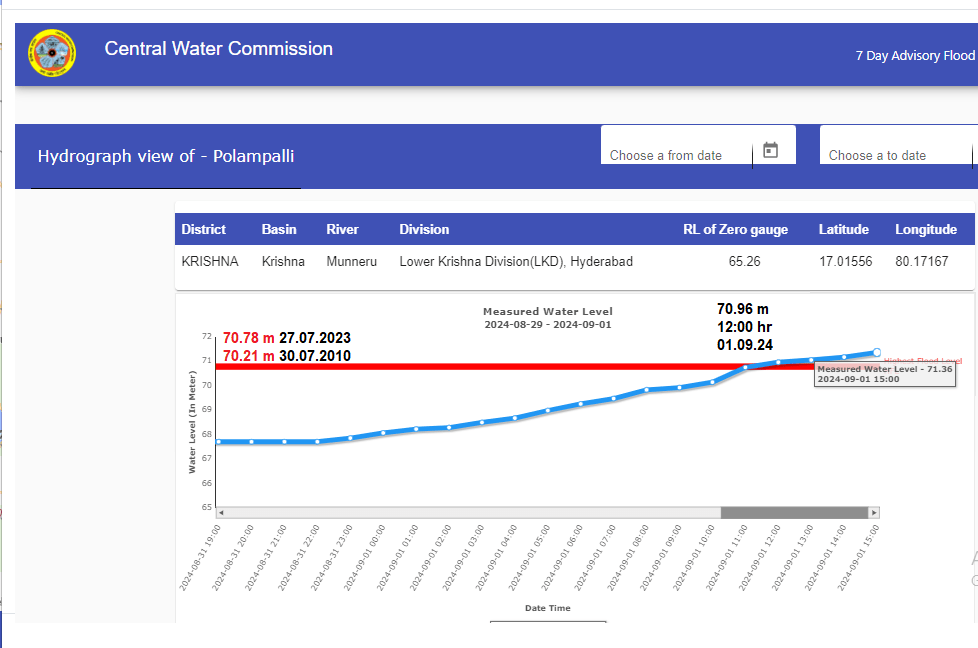 Andhra Pradesh: -1 River Munneru at Polampalli site in Krishna district has crossed old HFL 70.78 meter dated 27.07.2023 at 12:00 hour on 01.09.2024. Present flood level is 71.36 meter at 15:00 hour on 01.09.2024 with rising trend. The previous HFL for the site is 70.21 meter dated 30.07.2010.