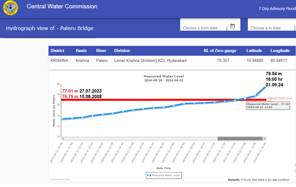 2 Munneru at Paleru site in Krishna district has crossed old HFL 77.01 meter dated 27.07.2023 at 14:00 hour on 01.09.2024. Present flood level is 79.54meter at 16:00 hour on 01.09.2024 with rising trend. The previous HFL for the site is 76.79 meter dated 10.08.2008.