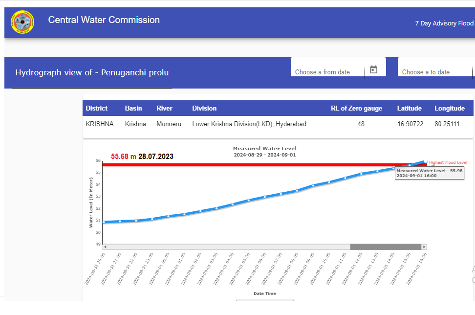 3 River Munneru at Penuganchi Prolu site in Krishna district has crossed old HFL 56.68 meter dated 27.07.2023 at 16:00 hour on 01.09.2024.