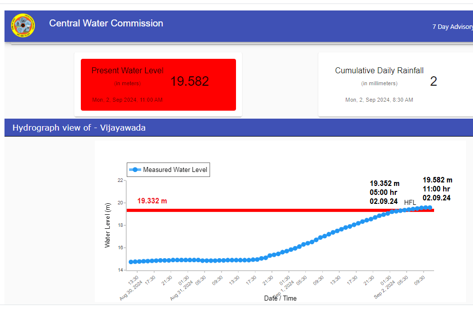 4 River Krishna at Vijaywada site in Krishna district has breached old HFL 19.332 meter date not mentioned by the CWC at 05:00 hour on 02.09.2024. Present water level is 19.582 meter at 11:00 hour on 02.09.2024.