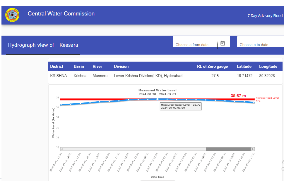5 River Munneru at Keesara station in Krishna district has crossed old HFL 35.67 meter date not mentioned by CWC at 23:00 hour on 01.09.2024 and has set 35.72 meter as new HFL at 01:00 hour on 02.09.2024.