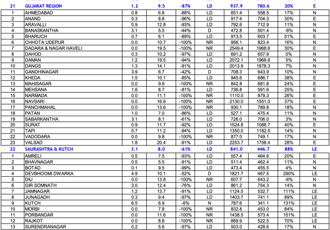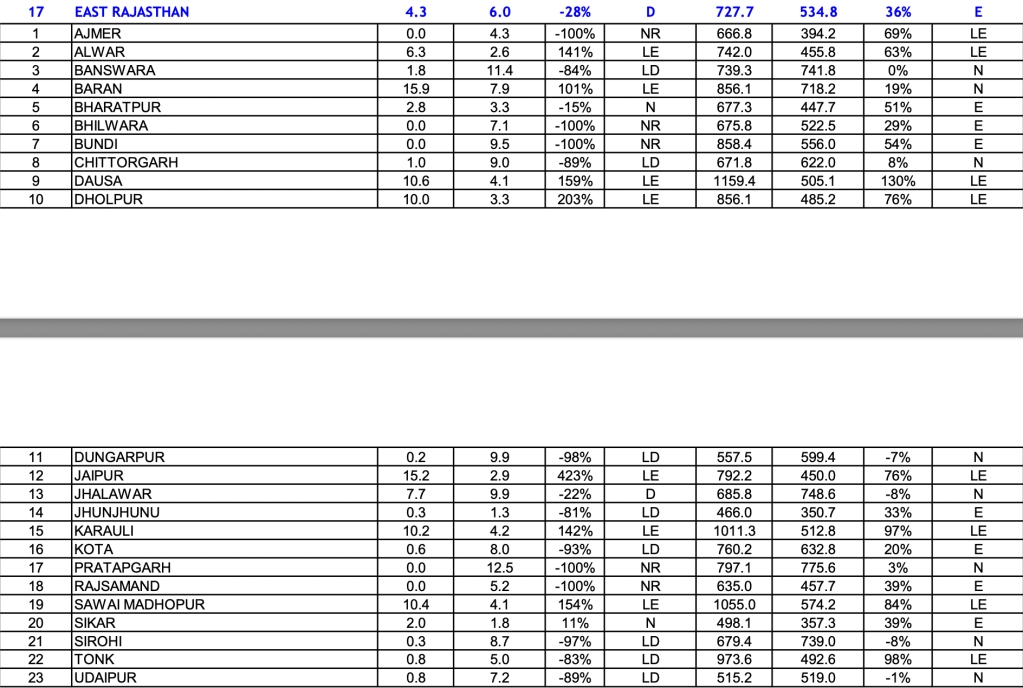Sub-Division wise rainfall IMD rainfall map for sub-division wise rainfall, out of IMD’s 36 subdivisions, three (W Rajasthan, Saurashtra-Kutch, Tamil Nadu-Puducherry-Karaikal) had Large Excess rainfall during June Aug 2024. It is interesting to note that all three sub divisions having large excess rainfall are low rainfall regions, out of them the drought prone W Rajasthan and Saurasthra-Kutch also had excess rainfall in the same period in 2023. Nine subdivisions had Excess rainfall during June Aug 2024. 19 sub divisions had normal rain, while five sub divisions (Jammu-Kashmir-Ladakh), Punjab, Himachal Pradesh, Bihar and Arunachal Pradesh) had Deficit rainfall. The Highest deficit was 25% for Bihar. Highest surplus was 88% in Saurashtra-Kutch, the same region also had the highest surplus in the same period last year. The Highest rainfall was 3331.1 mm in Coastal Karnataka.