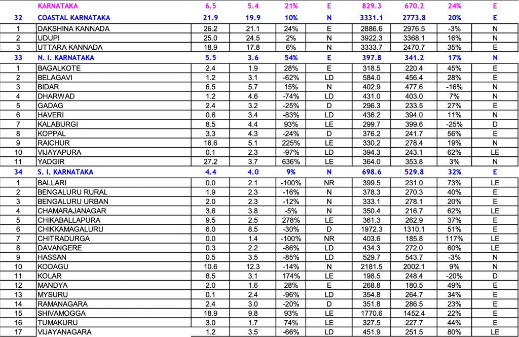 The Malnad region includes four districts: Kodagu, Chikkamagaluru, Shivamogga and Hassan. Also two districts. that IMD includes in S Karnataka, namely Ballari and VIjayanagar, are included by KSNDMC in North Karnataka. The reason for this different classification of districts by IMD and KSNDMC are not known.