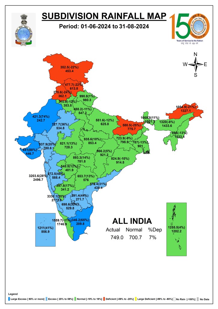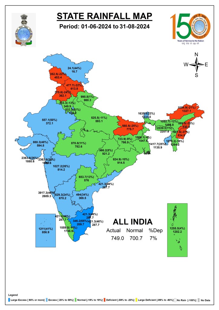 State wise rainfall As can be seen from IMD rainfall map for June-Aug 2024, only Tamil Nadu (65% excess) had large excess rainfall (above 60% surplus) in this period. Thirteen states and Union Territories (UTs) had Excess (rainfall 20-59% above normal) in this three month period. 14 states had normal rainfall with rainfall between 19% deficit and 19% surplus, while eight states (Bihar, Jammu and Kashmir, Punjab, Haryana, Chandigarh, Manipur, Arunachal Pradesh and Nagaland) had deficit rainfall with rainfall 20-59% below normal in these three months. Nagaland had the highest deficit at 28%. Goa had the highest rainfall at 3917.4 mm.