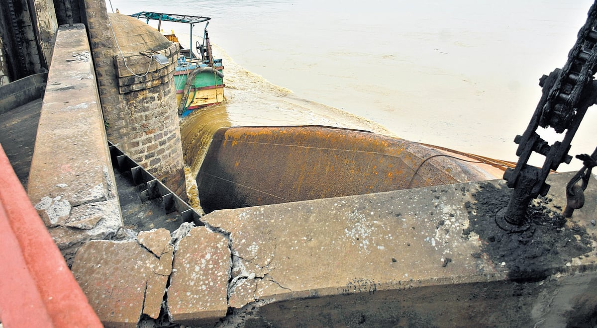 The Hindu report “Boats swept away in floods crash into Prakasam Barrage gate, denting a pillar’ headline stated that the traditional wooden boats used for tourism and ferrying passengers were five in numbers and the irrigation officials were discharging about 11.25 lakh cusec of flood water by lifting all 70 gates of the barrage when the boats hit Gate No. 69 and got stuck there. “The irrigation officials said the pillar and its base were damaged due to increased water pressure at the gate caused by the boat blockage…Irrigation authorities, who were alert, are trying to clear the boats. While one boat was washed away in the flood, the other four are still stuck at the pillar”, read the report.