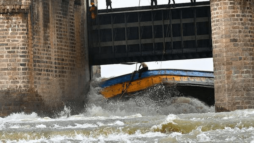 The Hindustan Times reported: “In an unprecedented situation in the history of 170-year-old Prakasam barrage on Krishna River in Andhra Pradesh’s Vijayawada, the state irrigation department authorities on Monday (Sept. 02) released 11.8 lakh cusecs of water from the barrage” by opening all the 70 gates to the maximum extent. It stated that while the officials were struggling to discharge an unprecedented flow into the Krishna River, three heavy sand-laden boats were swept away by the gushing floodwaters, colliding with the Prakasam barrage, causing significant damage to a pillar. Quoting Water Resources Department (WRD) Minister Nimmala Ramanaidu, the report further read “One of the boats became stuck after striking gate number. 69, forcing its closure. Officials immediately responded, working tirelessly to clear the vessels that were lodged against the barrage. There is no threat to the barrage, and it will be repaired soon after the floods recede,” the minister said.