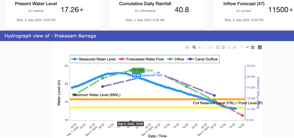 The New Indian Express report mentioned above reported, quoting irrigation officials that all 70 gates of the barrage were lifted at 2200 hours on Sept. 2, 2024, passing 11.03 lakhs cusecs of water, highest in 70 year history of the barrage. The report stated: “Previously, the Krishna River saw historic floods from October 2 to 13, 2009, when the maximum inflow recorded at Prakasam Barrage was 11,10,404 cusecs at 11 pm on October 5.”