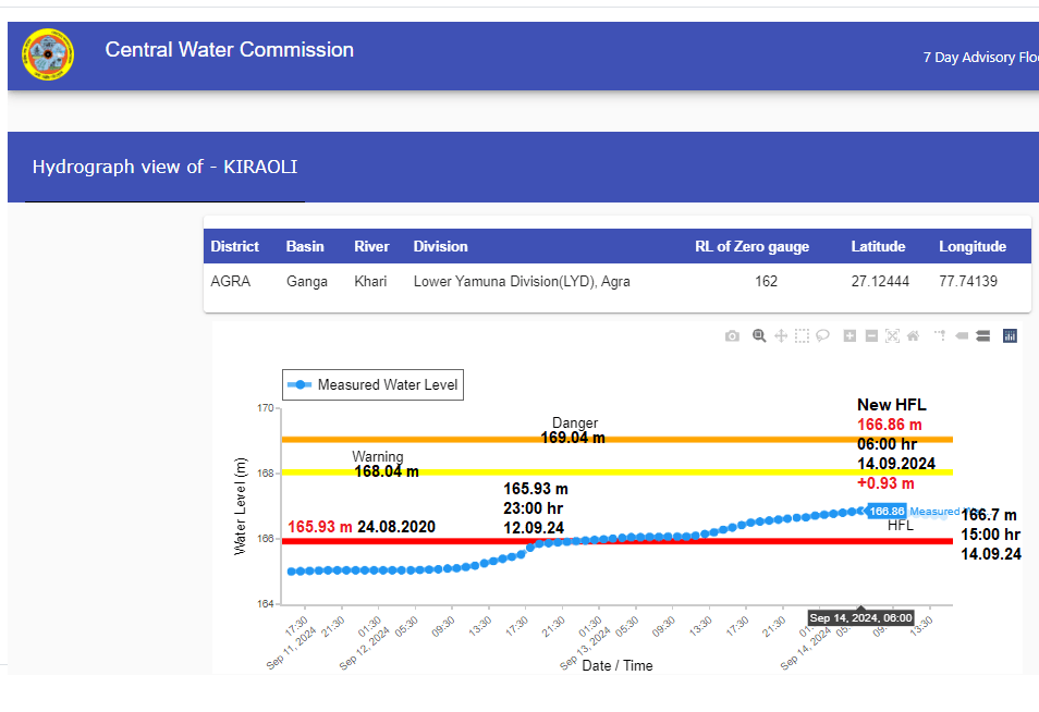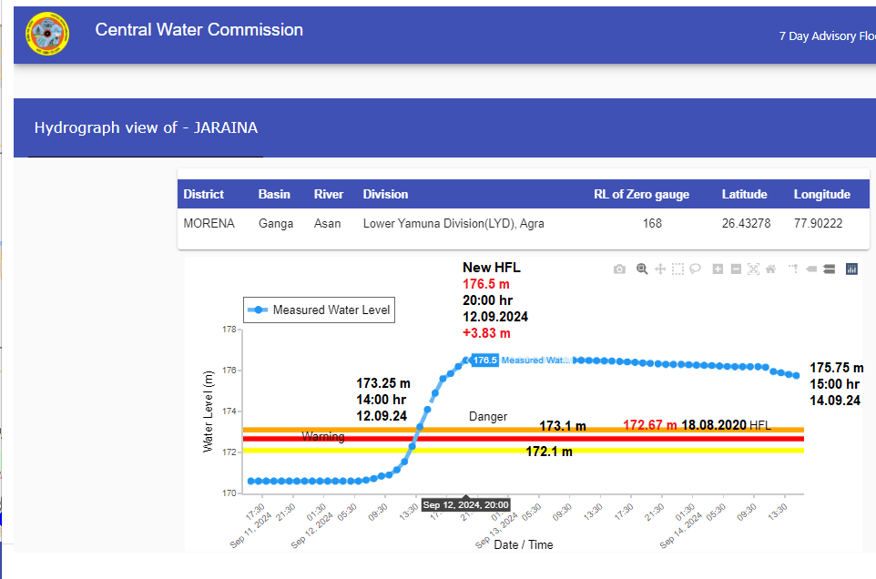 It is interesting to see that at least 11 rivers at as many flood monitoring sites of Central Water Commission (CWC) located in Bundelkhand region (4 sites) and lower Yamuna basin (7 sites) have crossed old Highest Flood Level (HFL) just in 2 days on September 12-13, 2024. These sites are in 3 different states of Madhya Pradesh (7 sites), Uttar Pradesh (3 sites) and Rajasthan (1 site).