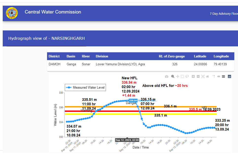 | 7 | Narsingh- garh/ Sonar | Damoh/ Madhya Pradesh | 335.5 m 16.09.2023 | 336.94 m 02:00 hour 12.09.2024 | 1.44 m |