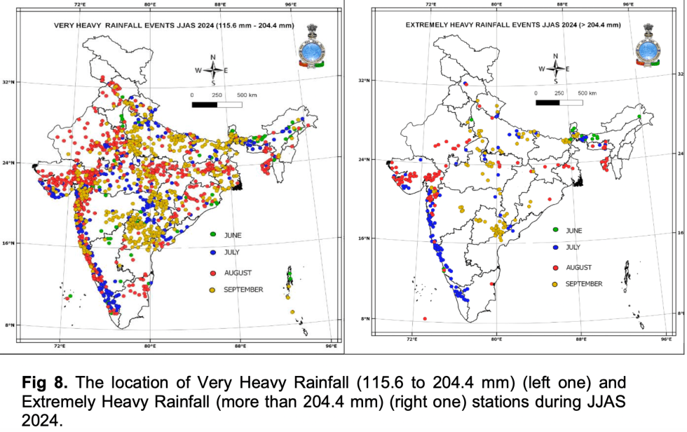 An analysis of the daily district wise rainfall data from India Meteorological Department (IMD) for the month of September 2024, the last month of India’s South West Monsoon 2024 shows that there were 546 (406 in Sept 2023[i], 417 in Sept 2022[ii] and 489 in Sept 2021[iii]) instances when district rainfall of a day was above 50 mm. Such high rainfall instances included 438 (330, 365 and 374 in Sept 2023, Sept 2022 and 2021 respectively) instances in Sept 2024 when rainfall was 50-100 mm, 73 (64, 47 and 84 in Sept 2023, Sept 2022 and 2021 respectively) instances in Sept 2024 when it was 100-150 mm, 30 (10, 3 and 20 in Sept 2023, Sept 2022 and 2021 respectively) times in Sept 2024 when it was 150-200 mm and 5 (2, 2 and 11 in Sept 2023, Sept 2022 and 2021 respectively) instances in Sept 2024 when rainfall in a day was above 200 mm.