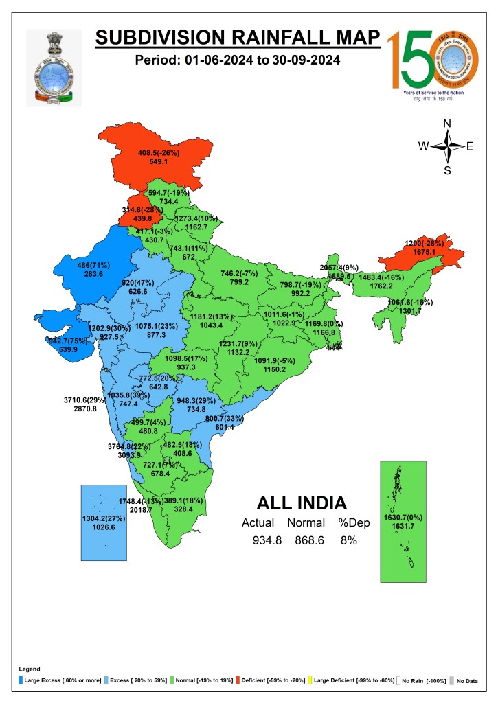 In the just concluded South West Monsoon 2024, India received 934.8 mm (820 mm in SW Monsoon 2023, 925 mm in SW Monsoon 2022[i]) rainfall, about 107.6% (94.45 % in 2023, 106.5% in 2022) of the Normal SW Monsoon rainfall of 868.6 mm as per India Meteorological Department (IMD). This rainfall is categorised as above normal rainfall.