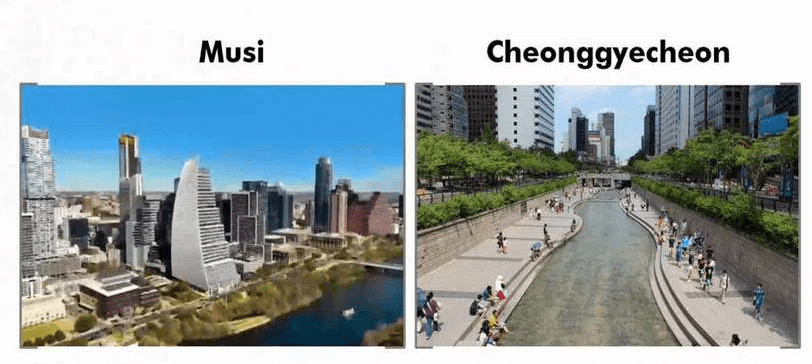 Musi; Hyderabad Questions over Seoul trip A delegation of nearly 20 people is visiting Seoul, South Korea to study Cheonggyecheon riverfront development project. And this is exactly what raises questions. Both projects have more differences than similarities. Unlike River Musi, Cheonggyecheon is a stream. While River Musi flows through nearly 250 kms, Cheonggyecheon covers about 13 kms and joins Jungnancheon, which connects to Han River and empties into the Yellow Sea.