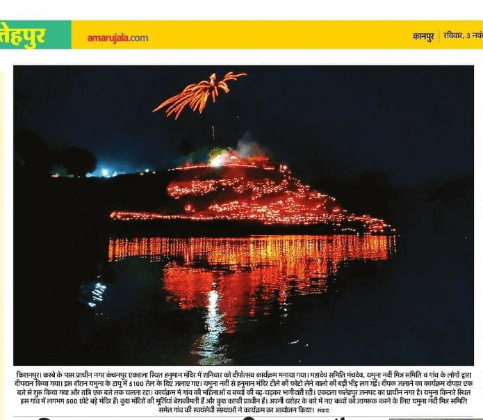 Fatehpur महावीर सेवा समिति एकडला द्वारा शनिवार (Nov. 02) कालिंदी के तट पर प्राचीन हनुमान मंदिर में दीपोत्सव का भव्य आयोजन किया गया। जहां गांव के प्रत्येक घर से शुद्ध सरसों का तेल इकट्ठा कर मिट्टी के दिवाली मेंगांव के पंचदेव मंदिर कलिका मंदिर शीतला मंदिर आदि सभी प्राचीन मंदिर तालाब व यमुना किनारेहनुमान मंदिर मेंकुल 5100 दीपक जलाए गए . https://www.livehindustan.com/uttar-pradesh/fatehpur/story-grand-deepotsav-celebration-at-ekdala-hanuman-temple-with-5100-diyas-201730563483890.html (02 Nov. 2024)
