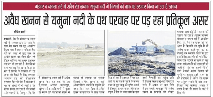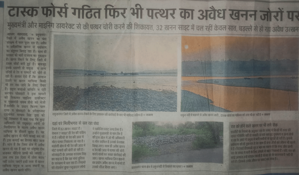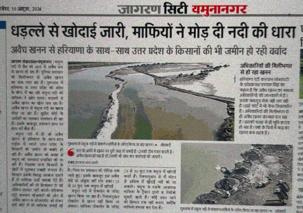 Yamuna Nagar Activists raise voice against illegal mining along Yamuna Several social organisations, including Haryana Anti-Corruption Society, Yamuna Nadi Mitra Mandal and SANDRP have raised voice against illegal and unscientific mining in Yamuna river in Yamunanagar district. These organisations have requested the govt to stop illegal and unscientific mining immediately alleging that it is posing a threat to the existence of the river.