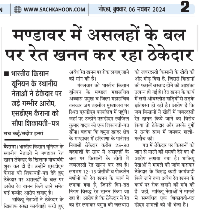 The primary issues raised by the BKU encompass: Lease of Sand Mining Rights: Granting sand mining leases at the Yamuna River ghats to the Nishads and Mallahs. Singh emphasized that the current restrictions on sand mining have severely impacted the livelihoods of workers from the Yamunapar area, pushing many to the brink of starvation and forcing youth to migrate to cities like Delhi and Mumbai for employment. https://en.themooknayak.com/livelihood/up-farmers-submerge-themselves-in-yamuna-river-temporarily-call-off-jal-satyagraha-after-official-assurance (25 June 2024)
