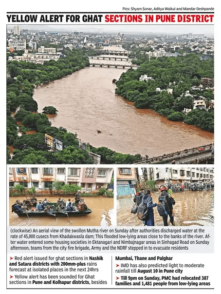 Dams flood in Pune Heavy rainfall in the dam areas and urban regions of Pune dist led to the release of water from Khadakwasla and Pavana dams, causing widespread flooding in Pune & surroundings. The Mula & Mutha rivers overflowed. All societies & settlements along the riverbanks were inundated. To ensure the safety of residents, help from the NDRF and the army was sought. Minister Muralidhar Mohol said that the large volume of water released from the dam created the flood situation in the city, highlighting the lack of coordination between the WRD & the Municipal Corp. https://punemirror.com/pune/civic/murlidhar-mohol-blames-water-resources-department-for-the-flood-says-prior-notice-should-have-been-given-before/cid1721987044.htm (26 July 2024)