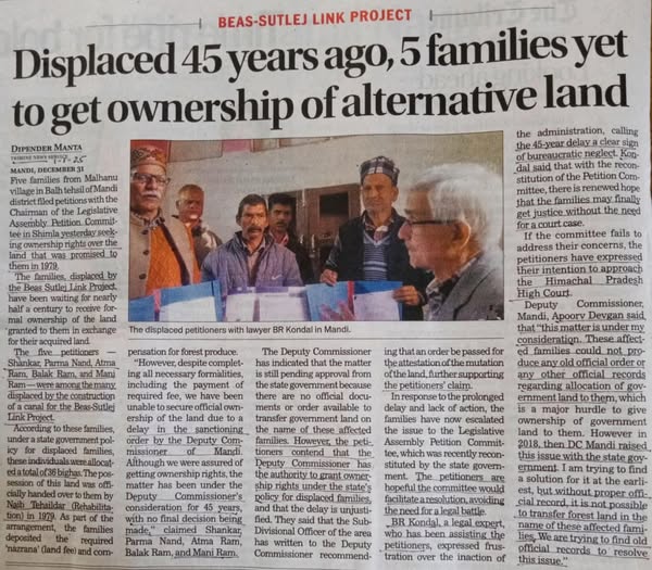 Himachal Pradesh Displaced 45 years ago, 5 families yet to get ownership of alternative land Those displaced by the Beas Sutlej Link project 45 years ago has still not received title of the rehab lands. Five families from Malhanu village in Balh tehsil of Mandi district filed petitions with the Chairman of the Legislative Assembly Petition Committee in Shimla yesterday (Dec. 31) seeking ownership rights over the land that was promised to them in 1979. The families, displaced by the Beas Sutlej Link Project, have been waiting for nearly half a century to receive formal ownership of the land granted to them in exchange for their acquired land. The five petitioners — Shankar, Parma Nand, Atma Ram, Balak Ram, and Mani Ram — were among the many displaced by the construction of a canal for the Beas-Sutlej Link Project.