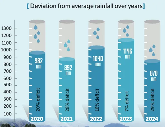 In 2023, the region received 1146.6 mm of rainfall (7 percent below average), while 2022 recorded 1040.4 mm (16 percent deficit). The figures dropped further in 2021 to 892.5 mm (28 percent deficit) and 982.2 mm (20 percent deficit) in 2020. The data indicates a worsening trajectory, with 2024’s precipitation levels approaching the record low of 802.5 mm from 1974.