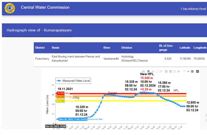 One of these four flood monitoring stations one is in Cauvery basin and the remaining three stations are part of East Flowing Rivers between Pennar and Kanyakumari basin. While the Bhavani river at Gandhavayal station has crossed the HFL after 11 years, the Ponnaiyar river at Vazhavachanur station has topped the old HFL by a margin of 3.32 meters. https://sandrp.in/2025/01/12/rivers-flowing-in-extreme-flood-situation-during-northeast-monsoon-2024/ (12 Jan. 2025)