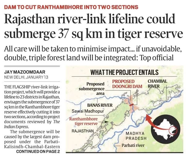 – The project envisages the submergence of 37 sq km in the Ranthambhore tiger reserve effectively cutting it into two sections, according to project documents reviewed by The Indian Express. The submergence will be caused by the largest dam proposed under the Parbati-Kalisindh-Chambal-Eastern Rajasthan Canal Project (PKC-ERCP), which is part of the ambitious Interlinking of Rivers (ILR) program. https://indianexpress.com/article/india/rajasthan-river-link-lifeline-could-submerge-37-sq-km-in-tiger-reserve-9777266/ (14 Jan. 2025)