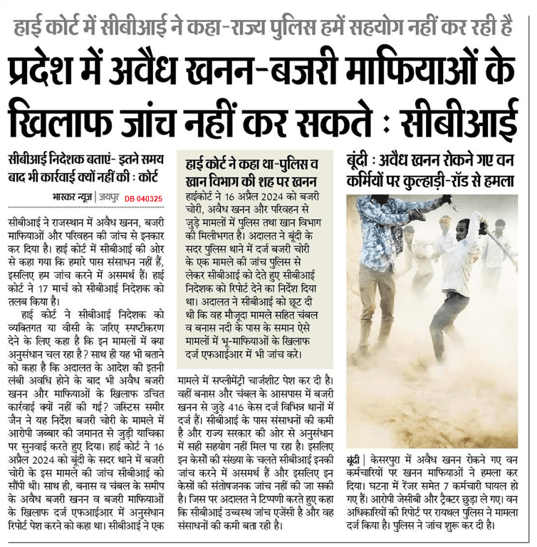 -In April 2024, the high court had directed the CBI to investigate illegal sand mining on the state’s Chambal and Banas riverbeds. The directive came in the case of one Shahrukh, who is accused of transporting 40 metric tonnes of sand in a dumper without a valid permit. The court asked the agency to investigate other sand mafias of the state too. Following that order, a case was registered by the central agency. https://thewire.in/law/unexpected-rajasthan-hc-cbi-director-praveen-sood-illegal-mining (05 March 2025)