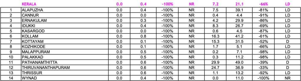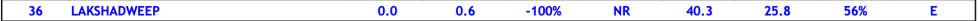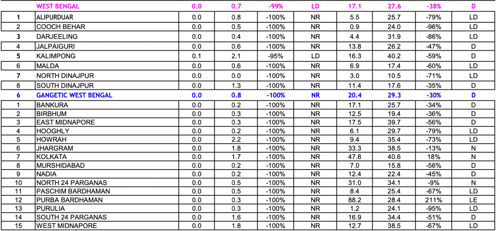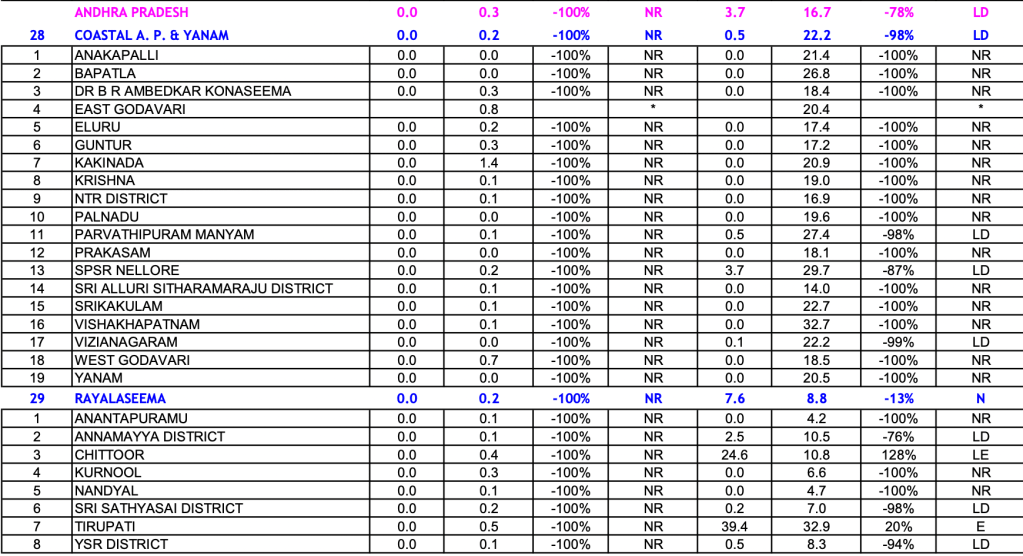 SUB DIVISION WISE RAINFALL As can be seen from the IMD map below, out of 36 meteorological sub divisions of India, None had large excess, 2 (Lakshadweep and Andaman-Nicobar) had Excess, 5 (Rayalseema, Coastal Karnataka, Tamil Nadu & Puducherry, Sub Himalayan W Bengal-Sikkim and Arunachal Pradesh) had normal, 8 had deficient, 16 had Large Deficient and 5 had NO RAIN.